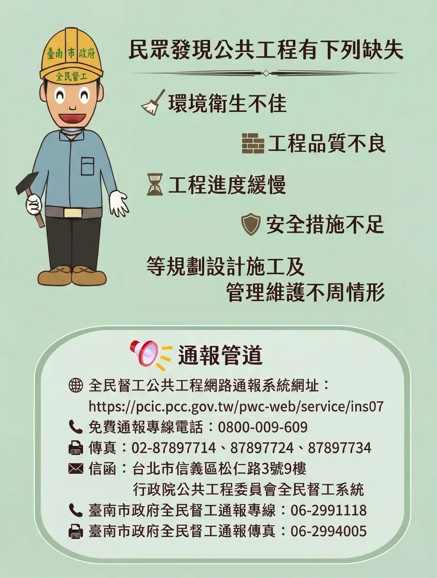 | 115.3.16 | 臺南市政府推動「全民監督公共工程運作機制」政策 | |