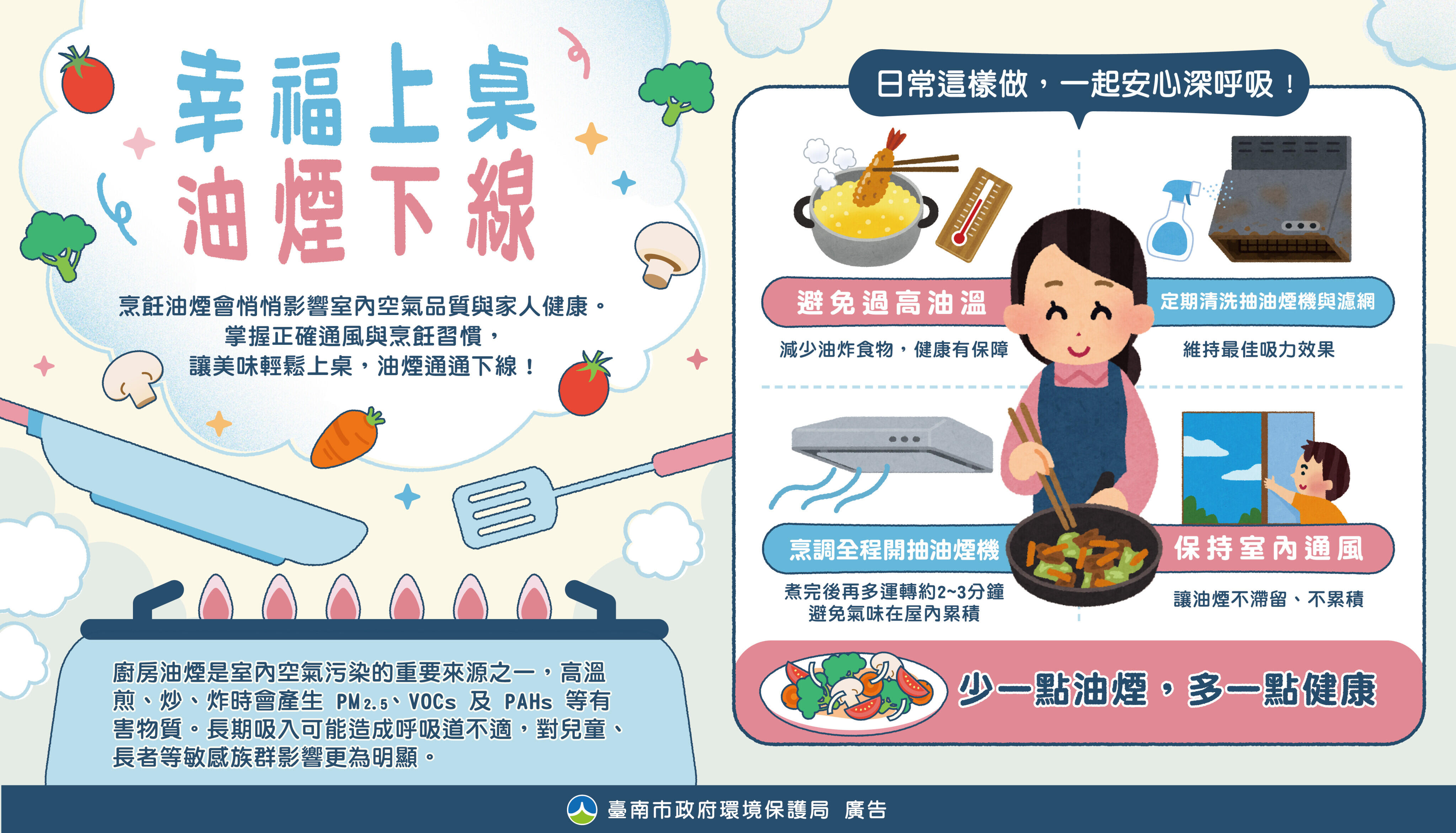| 115.3.24 | 烹飪時應開啟抽油煙機並保持室內通風,以維護居家空氣品質與家人健康 | |